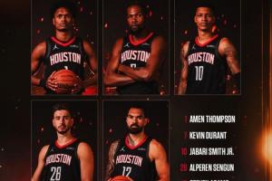 值得一提的是,這是一套“五大”陣容,五人身高分別為:阿門2米01、杜蘭特2米11、小史密斯2米11、申京2米11、亞當斯2米11,首發平均身高為2米09。