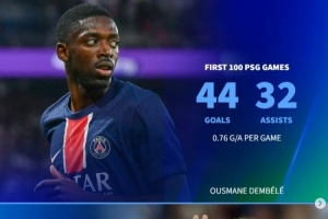 全文摘要:登貝萊迎來巴黎生涯100場里程碑,德轉對比了他與內馬爾、伊布、姆巴佩等前100場參與進球數據。登貝萊貢獻44球32助,場均參與0.76球,數據遜于內馬爾(1.29球)、伊布(1.18球)和姆巴佩(1.09球),但優于迪馬利亞和卡瓦尼。