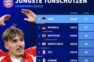 拜仁隊史歐冠最年輕進球者排名: