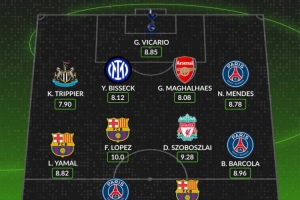 后衛:特里皮爾(紐卡,7.90分)、比塞克(國米,8.12分)、加布里埃爾(阿森納,8.08分)、努諾-門德斯(巴黎,8.78分)