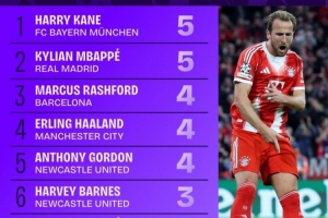 體育資訊10月23日訊 本賽季歐冠聯賽階段已戰罷3輪,Squawka統計了到目前為止歐冠進球數,拜仁前鋒凱恩和皇馬攻擊手姆巴佩都打進5球,分列前二位。