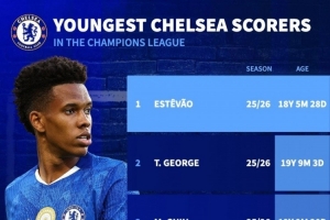 體育資訊10月23日訊 德國轉會市場列出了切爾西隊史歐冠最年輕進球者排名,埃斯特旺居首。