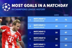 全文摘要:最新一輪歐冠賽事以18場71球創下歐冠歷史單輪進球數新紀錄。這一數據超越此前67球和64球的紀錄,成為歐冠史上進球最多的一輪比賽。