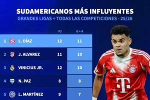 體育資訊10月24日訊 德國轉會市場統計了本賽季五大聯賽南美球員的參與進球數量,并列出榜單,路易斯-迪亞斯參與11球居首,阿爾瓦雷斯、維尼修斯參與10球次席。