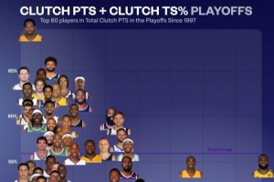 全文摘要:NBA University自1997年來統計季后賽關鍵得分前60球員的真實命中率。詹姆斯得分總量遙遙領先,效率略低于平均;羅伯特-霍里效率高居第一,但得分總量僅入圍線附近。圖表位置上為效率高,右為總量高。