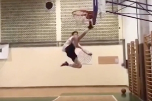 舍什科說:“是的,那確實是我。挺搞笑的,因為當時球卡在籃框,我也不知道為什么就想用腳去把它夠下來。這可不是每個人都能做到的。”