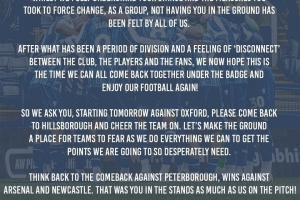 所以我們請求你們,從明天對陣牛津聯的比賽開始,請回到希爾斯堡球場為球隊加油助威。讓我們把這座球場變成客隊恐懼的地方,因為我們將竭盡所能去爭取我們如此迫切需要的積分。