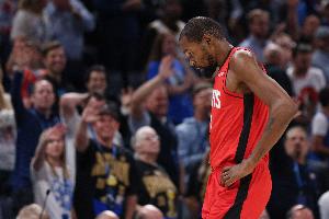 比賽最后幾分鐘的大部分進攻回合,火箭都是由杜蘭特負責持球推進。每一次他持球,現場18055名觀眾都會起身歡呼,為這位球隊新核心得分手喝彩,杜蘭特也注意到了這一點。