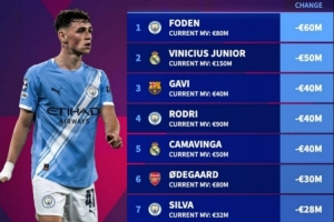 全文摘要:德轉發布2025年足壇球員身價跌幅榜。福登以6000萬歐的跌幅高居榜首,維尼修斯下跌5000萬歐位列第二,加維、羅德里等9名球員也身價大幅縮水,總計跌幅達3.78億歐。