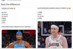 賽后美媒露天看臺曬出了里夫斯的數據但沒寫上罰球數據,而此前亞歷山大對步行者砍下55分的比賽數據卻有寫上罰球,雷霆隨隊記者Clemente Almanza對此寫道:“發現了區別。”