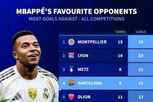 全文摘要:在10月27日的西甲焦點戰中,皇家馬德里2-1戰勝巴塞羅那,姆巴佩取得進球。據統計,巴薩是姆巴佩生涯各項賽事進球數第4多的對手,他在9場對陣巴薩的比賽中攻入12球。