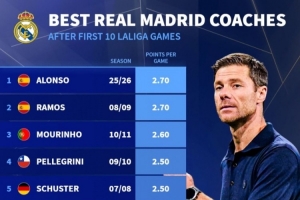 全文摘要:皇馬主帥阿隆索執教前10輪西甲表現驚艷,場均2.70分,與拉莫斯并列歷史第一。他帶隊在2-1戰勝巴薩的焦點戰后,延續了出色的開局戰績,展現了卓越的執教能力。