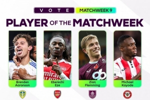 全文摘要:英超官方公布了第9輪最佳球員的8人候選名單。入選球員包括利茲聯的阿隆森、阿森納的埃澤、伯恩利的弗勒明、布倫特福德的卡約德、曼聯的姆伯莫、維拉的奧納納、熱刺的范德芬以及桑德蘭的扎卡。