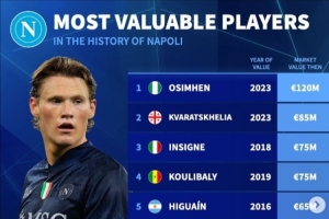 全文摘要:德國轉會市場統計了那不勒斯隊史身價前10球員。奧斯梅恩以1.2億歐位列第一,克瓦拉茨赫利亞(8500萬歐)和因西涅(7500萬歐)分列二、三位。榜單中既有現役球星,也有如卡瓦尼、伊瓜因等名將,展現了那不勒斯不同時期的陣容實力。