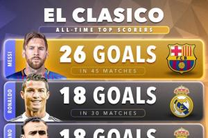 國家德比歷史射手榜,梅西26球遙遙領先,C羅、迪斯蒂法諾18球并列第2,本澤馬16球,勞爾15球,TOP5僅1名巴薩球員。