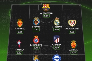 中場:費蘭-尤特格拉(塞爾塔,8.52分)、愛德華多-埃克斯波西托(西班牙人,7.97分)、巴埃納(馬競,7.77分)、哈恩·比爾希利(馬洛卡,7.70分)