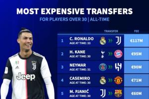 30歲以上球員轉會費榜:C羅33歲1.17億歐居首 凱恩內馬爾分列二三