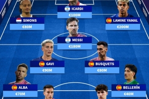 全文摘要:德國轉會市場統計了巴薩青訓球員的歷史最高身價陣容。該陣容由亞馬爾(2億歐)和梅西(1.8億歐)領銜,總價值達9.9億歐。加維、伊卡爾迪、奧納納等名將也在列,展現了巴薩青訓營的雄厚實力。