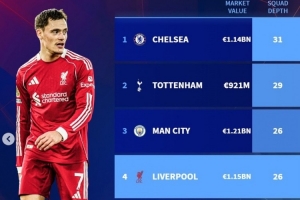 全文摘要:利物浦聯賽杯大輪換0-3慘敗,主帥斯洛特抱怨人手不足。《轉會市場》隨即統計英超BIG6陣容深度:阿森納總身價最高(13.1億),切爾西(11.4億)與利物浦(11.5億)緊隨其后;曼城陣容最精簡(26人),切爾西人數最多(31人),曼聯總身價最低(7.30億)。