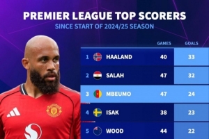 全文摘要:《轉會市場》統計顯示,上賽季至今英超射手榜中,哈蘭德以40場33球反超薩拉赫升至榜首。薩拉赫47場32球位居次席,姆伯莫以47場24球排名第三。伊薩克、伍德等球員緊隨其后。