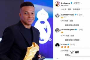 全文摘要:皇馬前鋒姆巴佩榮膺個人首座歐洲金靴獎。他在社媒發文感謝隊友與球迷的支持。隊友貝林厄姆用王冠表情包互動,盛贊其王者風范。