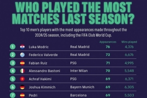 全文摘要:根據FIFPRO統計,上賽季球員出場榜中,莫德里奇以76場、4376分鐘位居榜首。皇馬球員包攬前二,巴爾韋德72場居第二。法比安-魯伊斯、巴斯托尼等球員緊隨其后,巴黎圣日耳曼有多名球員上榜,展現了高強度的賽程。