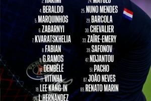 前鋒:7-克瓦拉茨赫利亞、9-貢薩洛-拉莫斯、10-登貝萊、19-李剛仁、29-巴爾科拉、47-恩賈恩圖