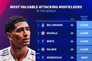 體育資訊11月2日訊 德國轉會市場列出了進攻型中場身價排名,貝林厄姆1.8億歐居首,穆西亞拉1.4億歐次席。