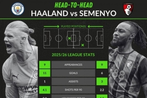 全文摘要:曼城將戰伯恩茅斯,WhoScored對比兩隊前鋒哈蘭德與塞梅尼奧數據。哈蘭德9場11球1助,效率更高;塞梅尼奧9場6球3助,助攻和關鍵傳球更優。哈蘭德場均預期進球1.0,評分7.84,均占優。