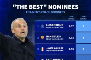 最佳教練候選上賽季成績:恩里克5冠、弗里克3冠、阿爾特塔0冠