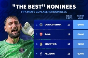 全文摘要:FIFA公布年度最佳男足門將候選名單。德國轉會市場列出了他們的身價排名:多納魯馬與拉亞以4000萬歐并列榜首,庫爾圖瓦和阿利松同為2000萬歐,馬丁內斯1600萬歐。其余候選人索默、諾伊爾和什琴斯尼身價分別為400萬歐和100萬歐。