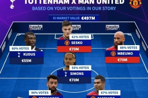 全文摘要:德轉票選了英超熱刺對曼聯的潛在最佳陣容。該陣容由曼聯主帥阿莫林領銜,門將熱刺的維卡里奧把守。后防由曼聯的盧克-肖、德里赫特和熱刺的范德芬、波羅組成。中場則匯集了曼聯的B費、卡塞米羅和熱刺的西蒙斯。鋒線上,熱刺的庫杜斯與曼聯的舍什科、姆伯莫搭檔。
