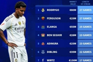 全文摘要:德轉盤點了身價2500萬歐以上陷入進球荒的攻擊手。羅德里戈與弗格森均連續27場未進球,并列榜首;伊蘭加25場緊隨其后。榜單中還包括維爾茨、馬杜埃凱等多位知名球員,身價從2500萬歐至1.3億歐不等,反映了高身價球員同樣面臨進球效率問題。