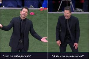 在一次犯規判罰之后,鏡頭拍到了馬競主帥西蒙尼正在對主裁曼薩諾抗議:“嘿!你在吹什么!冷靜點!就為了這個出牌?”西蒙尼最后又搖著頭說:“你不敢對維尼修斯出牌。”然后他又盯著第四官員重復了一遍這句話。