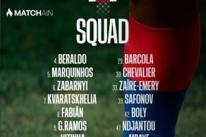 全文摘要:巴黎法甲第12輪將客場挑戰里昂,球隊公布了大名單。阿什拉夫、登貝萊、努諾-門德斯、杜埃等多名主力球員因傷缺席。門將由舍瓦利耶領銜,前鋒線上則有克瓦拉茨赫利亞、拉莫斯等球員在列。
