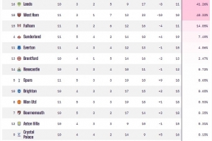 根據OPTA超級計算機的預測,狼隊的降級概率已高達90.31%,伯恩利降級概率也超過5成為50.12%,排在伯恩利身后的為諾丁漢森林(44.92%)、利茲聯(41.26%)、西漢姆聯(40.33%)以及富勒姆(14.85%)。值得一提的是,身為升班馬的桑德蘭表現驚艷,目前他們在英超中高居第4位,降級概率僅為7.49%。