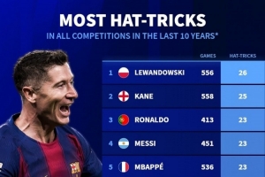 全文摘要:德國轉會市場統計了近十年前十聯賽球員的戴帽次數。萊萬以26次戴帽位居榜首,凱恩以25次緊隨其后。C羅、梅西和姆巴佩則同以23次并列第三,哈蘭德以21次排名第四。阿圭羅、蘇亞雷斯、本耶德爾和奧巴梅揚均以10次戴帽并列第五。