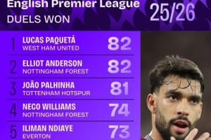 本賽季英超成功對抗榜:(次數相同,出場時間少者在前)