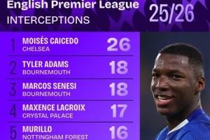 體育資訊11月11日訊 英超聯賽已經進行了11輪,squakwa也統計了本賽季英超攔截次數情況,凱塞多獨自領跑。