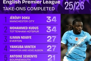 全文摘要:英超11輪戰罷,官方統計了成功過人榜。曼城的多庫與熱刺的庫杜斯以34次成功過人并列榜首。埃弗頓的恩迪亞耶與布萊頓的明特以27次并列第三,阿森薩卡等球員也躋身前十。