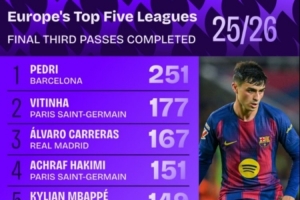 全文摘要:據Squawka統計,本賽季五大聯賽進攻三區傳球數,巴薩佩德里以251次斷檔第一。皇馬表現強勢,有卡雷拉斯、姆巴佩、巴爾韋德和居勒爾4人躋身前十。