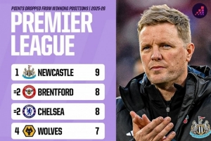 本賽季英超領先情況下丟分榜: