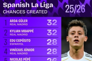 體育資訊11月12日訊 Squawka統計本賽季西甲創造機會次數,居萊爾、姆巴佩32次最多。