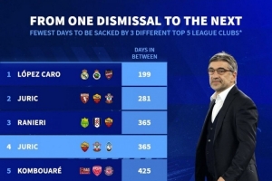 本世紀五大聯賽教練最短時間被三家俱樂部解雇排名: