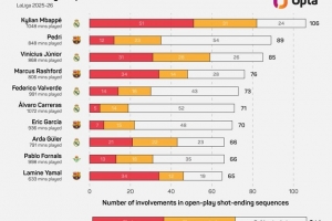體育資訊11月12日訊 據Opta統計,姆巴佩本賽季聯賽參與106次以射門終結的進攻,西甲球員中最多。