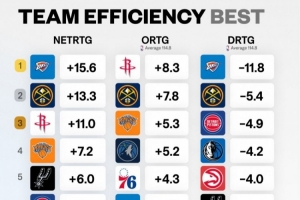 全文摘要:美媒Basketball University公布賽季效率榜:雷霆凈效率(+15.6)與防守效率(-11.8)均居首,火箭進攻效率(+8.3)領跑。掘金在凈效率和進攻效率分列第二,防守效率第三。尼克斯、馬刺等隊也躋身各項前十。