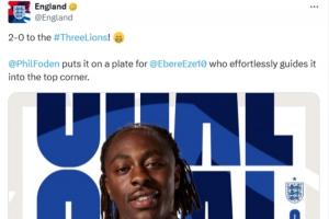 英格蘭官方在播報進球時寫道:“三獅軍團2-0領先!福登將球喂到嘴邊,埃澤毫不費力地將球送入上角。”