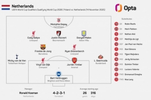 全文摘要:世預賽荷蘭客場對陣波蘭,其首發陣容無一名意甲球員,為2018年9月以來首次。門將維爾布魯根領銜,后防線由熱刺、利物浦等球員組成。中場匯聚巴薩、利物浦等豪門球員,前鋒德佩來自科林蒂安。