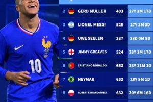 全文摘要:法國球星姆巴佩在對陣烏克蘭的世預賽中,以26歲10個月24天的年齡,達成職業生涯400球里程碑,成為史上最年輕的400球球員。他僅用537場比賽便完成此壯舉,在球員達成400球的年齡排名中位列第一。