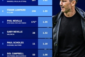 全文摘要:英格蘭“黃金一代”球員轉教練后,執教能力曾受質疑。德國轉會市場統計了他們的執教戰績,杰拉德以場均1.82分居首,蘭帕德以1.55分次席。內維爾兄弟、斯科爾斯、坎貝爾和魯尼緊隨其后,但場均得分均低于1.8分。